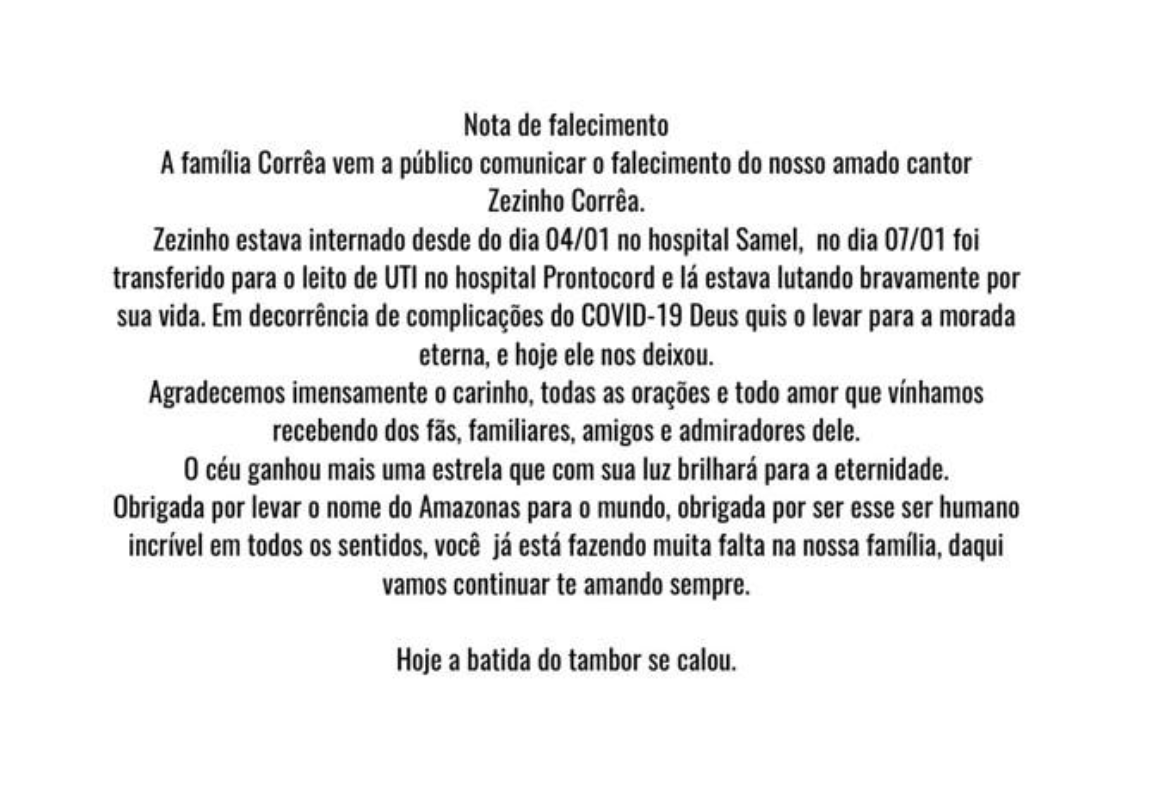 “No dia 07/01 foi transferido para o leito de UTI no Hospital Prontocord e lá estava lutando bravamente por sua vida. Em decorrência das complicações da Covid-19, Deus quis levá-lo para sua morada eterna, e hoje ele nos deixou”, continuou o comunicado.