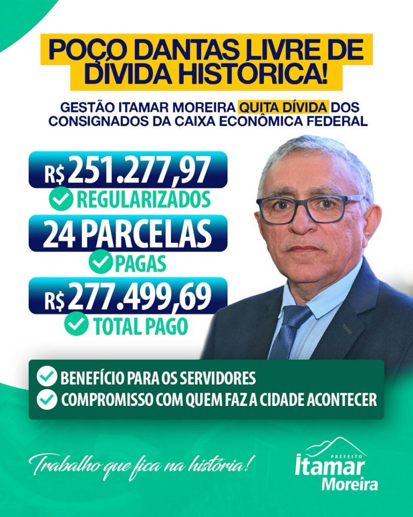 Nesta terça-feira, 20 de agosto de 2025, a gestão do prefeito Itamar Moreira alcançou um marco histórico em Poço Dantas: a quitação definitiva do parcelamento dos consignados da Caixa Econômica Federal, encerrando uma pendência financeira que se arrastava há anos e comprometia o município.