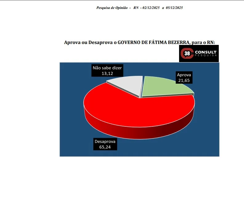 Segundo a pesquisa, o índice de desaprovação do governo Fátima Bezerra continua seguindo uma tendência de crescimento, chegou a 65,24% em dezembro, voltando a patamar de maio, que era de 65,18%.