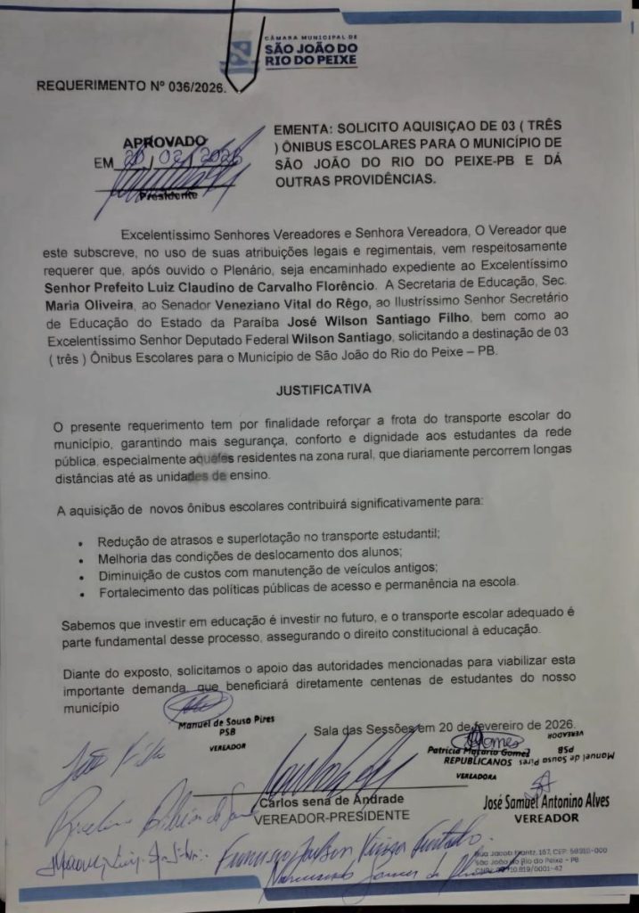 O vereador Carlos Medeiros apresentou o Requerimento nº 036/2026 solicitando a aquisição de 03 (três) ônibus escolares para o município de São João do Rio do Peixe.