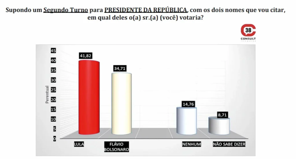 Em um eventual segundo turno entre Lula e Flávio Bolsonaro, o petista ampliaria a vantagem, alcançando 41,82%, contra 34,71% do adversário. Já 14,76% dos eleitores não votariam em nenhum dos dois pré-candidatos e 8,71% não souberam responder.