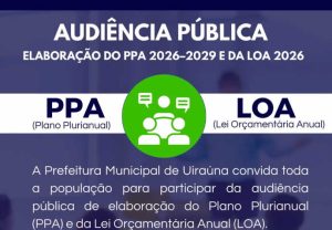 A Prefeitura Municipal de Uiraúna, por meio da Secretaria da Fazenda Pública e Secretaria de Planejamento, convida toda a população para participar da Audiência Pública de elaboração do Plano Plurianual (PPA) para o período de 2026 a 2029 e da Lei Orçamentária Anual (LOA) para 2026. Este é um momento crucial para que a comunidade se envolva diretamente no futuro da nossa cidade, ajudando a definir as prioridades e os investimentos que serão realizados nos próximos anos.